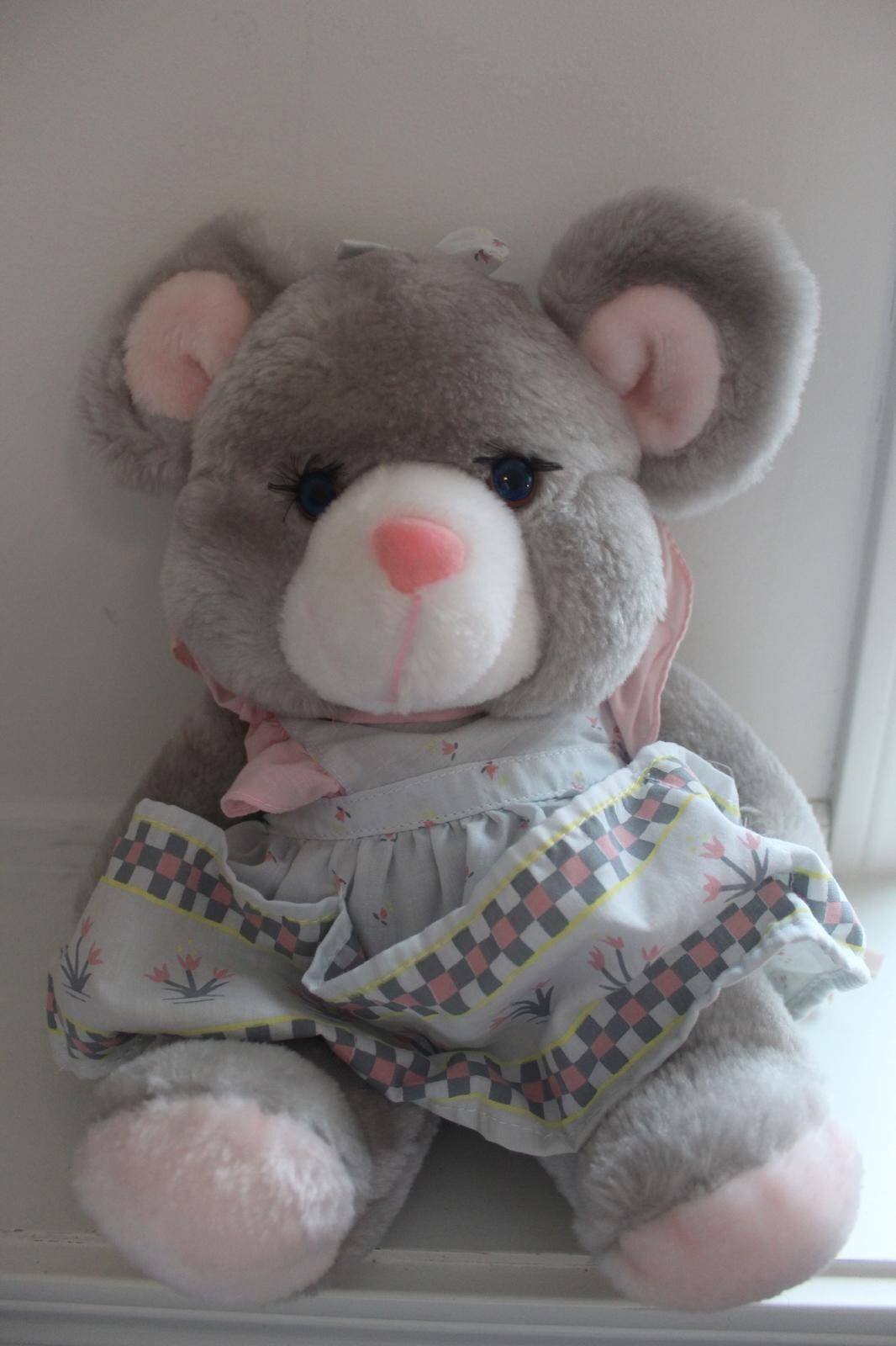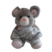 This adorable vintage grey plush teddy bear is dressed in a charming pastel floral dress with a matching apron. Featuring soft fur, pink accents, blue eyes with long lashes, and a sweet embroidered nose, this cuddly bear is perfect for collectors, vintage toy enthusiasts, or as a heartfelt gift.