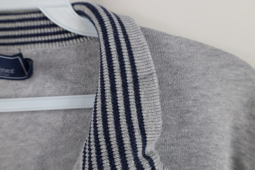 Dark spots, pilling. Blemish collar. Collar, cuffs discolored. Color faded. Tag partially unstitched
