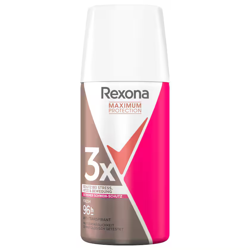 Rexona Maximum Protection Anti-Perspirant Spray Fresh Mini offers maximum protection against excessive sweating and body odor ? all in a handy mini format. In addition, the citrus scent of this women's deodorant provides a long-lasting feeling of freshness. Rexona Maximum Protection Anti-Perspirant Mini offers the strongest protection, providing triple protection against stress, heat, and exercise. The alcohol-free formula is dermatologically proven to be gentle on the skin and suitable for daily use. Let's start with the most important thing: sweating is completely normal. There are several reasons for this: high temperatures, physical activity, stress ? in all of these situations, the body cools down through sweating. Only 1% of body sweat is found under the armpits ? but this is precisely where sweat odor and stains can become very unpleasant and bothersome. This is where deodorants and antiperspirants help. This is how it works: The active ingredients in antiperspirants spread across the skin's surface and, when combined with the body's own moisture, form a kind of gel. This coats the sweat glands, providing reliable 48 hours of protection. Directions for use: Shake the Rexona Anti-Perspirant Mini to activate the ingredients. Then, from a distance of 15 cm, spray evenly onto your underarms in short bursts. You're ready to start the day feeling fresh. For a sustainable future, the aluminum used in the deodorant packaging is infinitely recyclable and was produced using 100% green electricity. After emptying, please dispose of it in the recycling bin (within the EU).