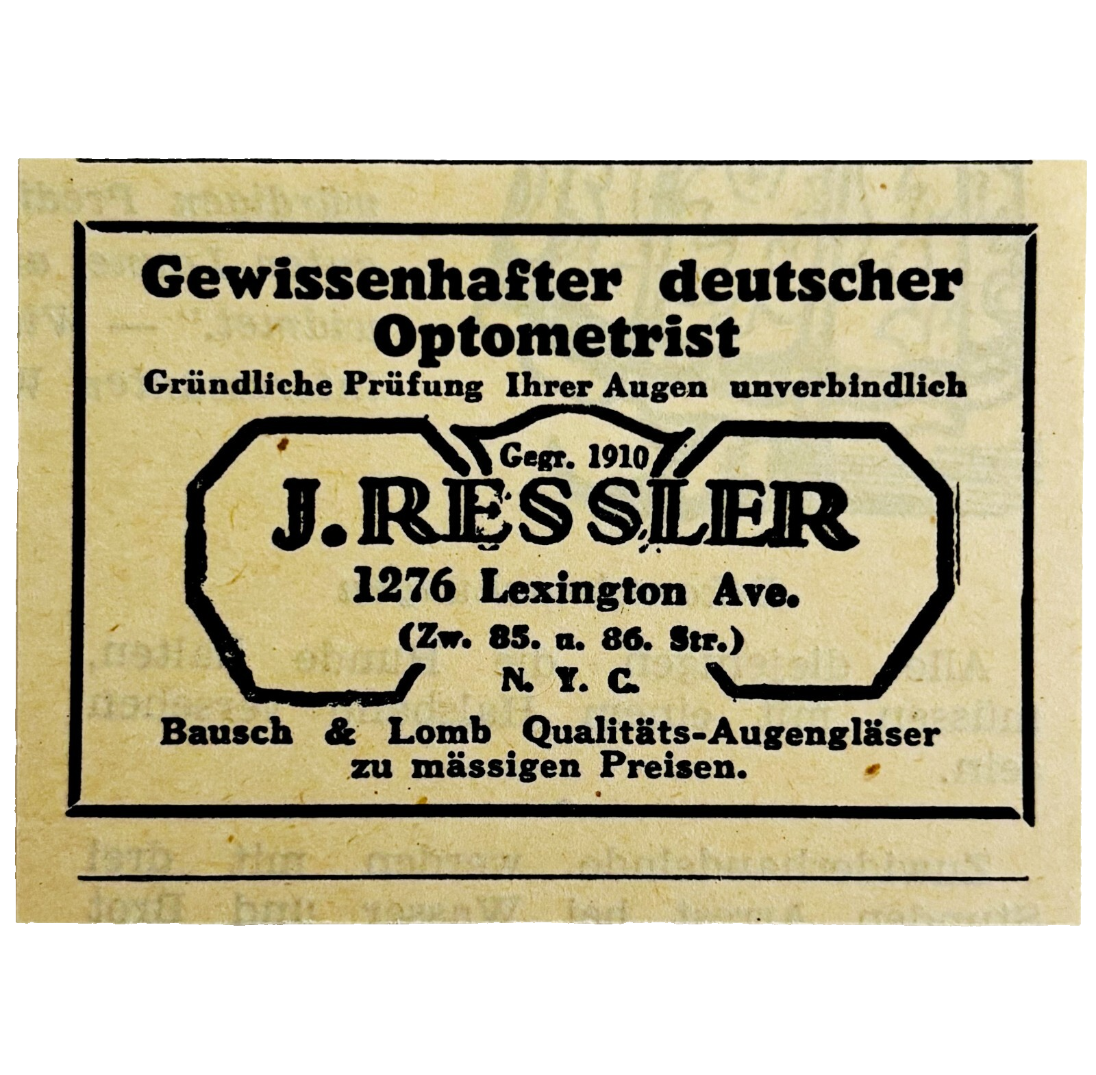 1945 WW2 German-USA Advertisement Ressler Optometrist Bausch & Lomb NYC C94A
