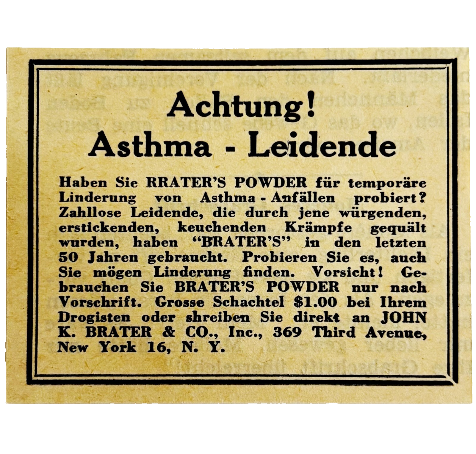 1945 WW2 German-USA Medical Advertisement Brater's Powder Asthma NYC C94A