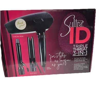 Brand new Sultra ID Triple Threat 3-in-1 Hair Essentials Set. Includes a full-size hair dryer, flat iron, and curling iron with interchangeable attachments that lock into a single base for space-saving convenience. Features fast heat-up time, ceramic coating, dual temperature settings (338F 392F), and a 9-ft no-tangle cord. The dryer includes an ionic generator to reduce frizz, two heat/speed settings, and a cool shot button. Lightweight design with 1000-watt power. Perfect for creating endless styling options at home or on the go.