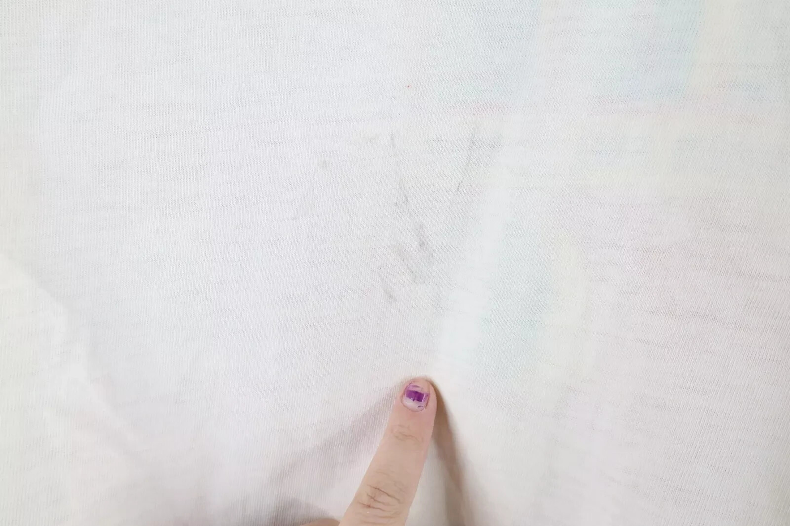 Hole on the right shoulder near the collar. Collar is a different shade. Has discoloring and color fade. Blemishes on the back. USA made
