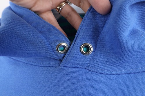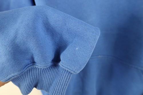 Blemishes on front and right shoulder. Discoloring around hood. Missing hoodstring. Has color fade