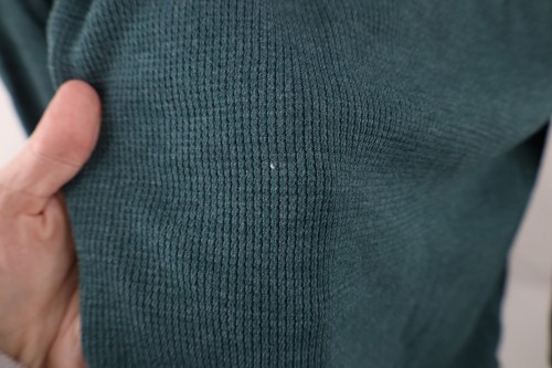 Blemishes front, back. Hole left arm. Loose threads front of collar, left armpit, cuffs. Collar, cuffs discolored. Color faded. Pilling