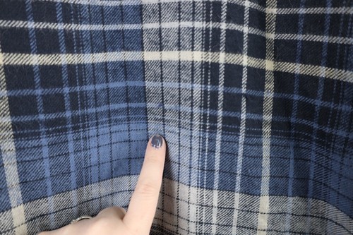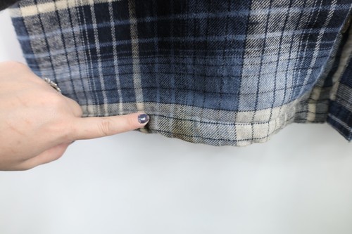 Stain front bottom right. Fabric pull middle back. Color faded. Body is fleece lined, sleeves are quilt lined