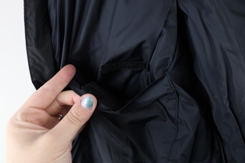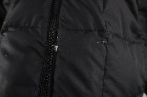 Holes front bottom, right sleeve. Goosedown poking out of fabric throughout. Collar pilled