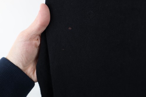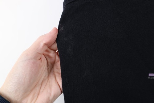 Blemishes front, stain back. Collar, armpits discolored. Graphics, cracking/faded. Color faded. Pilling