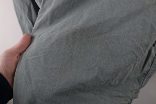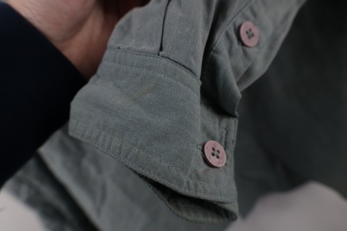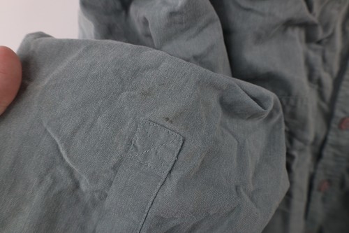 Stains throughout, collar and cuffs. Mended hole middle back. Collar ripped, distressed. Collar, cuffs discolored. Color faded