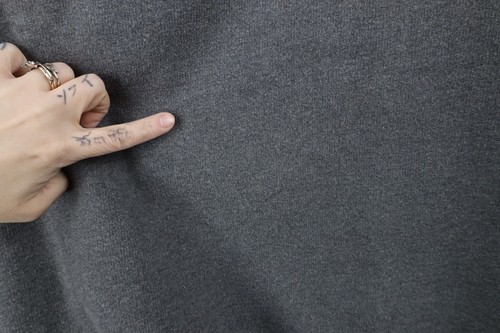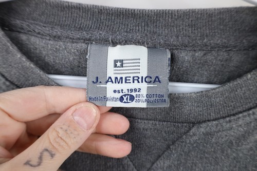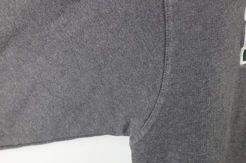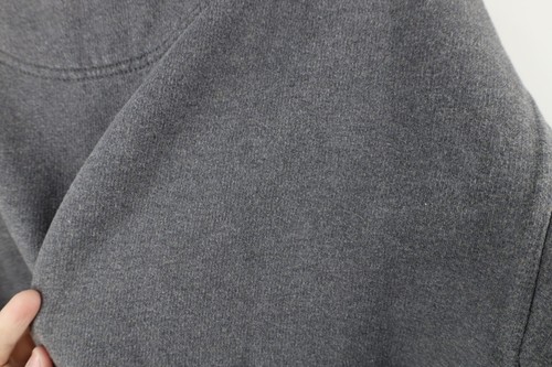 Dark spots front, back, right arm. Collar, cuffs discolored. Design distressed. Color faded. Pilling