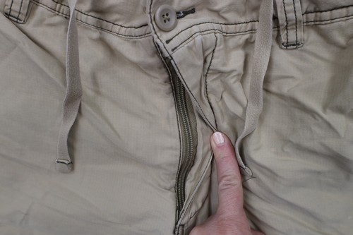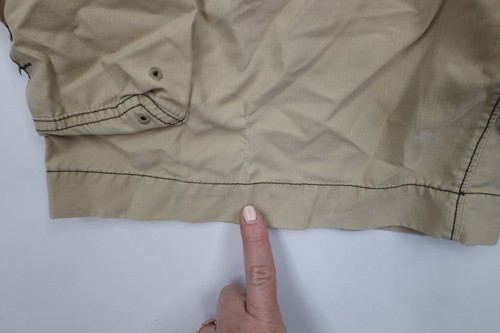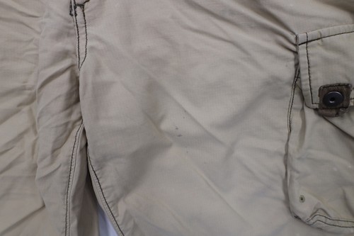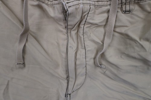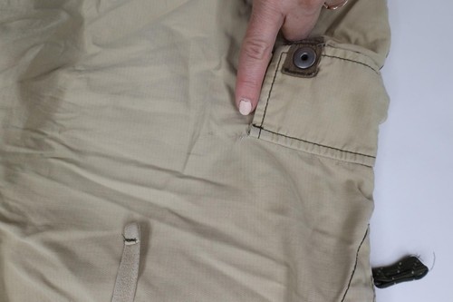 Mended rip bottom right leg and side right seam near the hand pocket. Hole in corner of right cargo pocket.Bleach stains and blemishes front and back. Distressed and faded