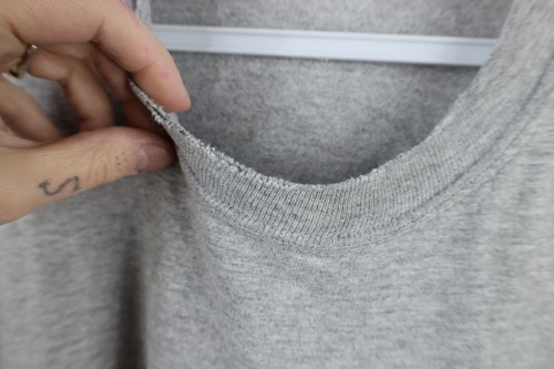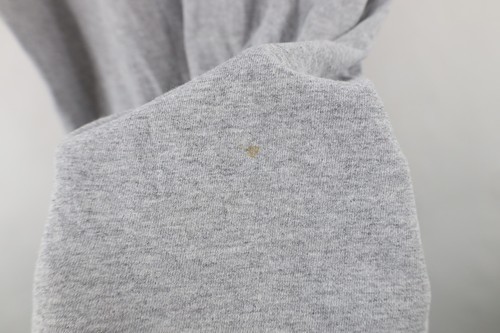 Holes front, armpits, collar. Stains front. Collar, armpits/arms discolored. Graphics, color faded. Pilling
