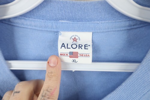 Bleach blemishes front, stains left arm/shoulders. Loose threads bottom hem. Collar discolored. Graphics, color faded. Pilling. Made in USA
