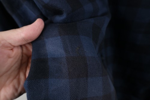 Stains front, back bottom, both cuffs. Inner collar discolored. Has pilling. Color faded