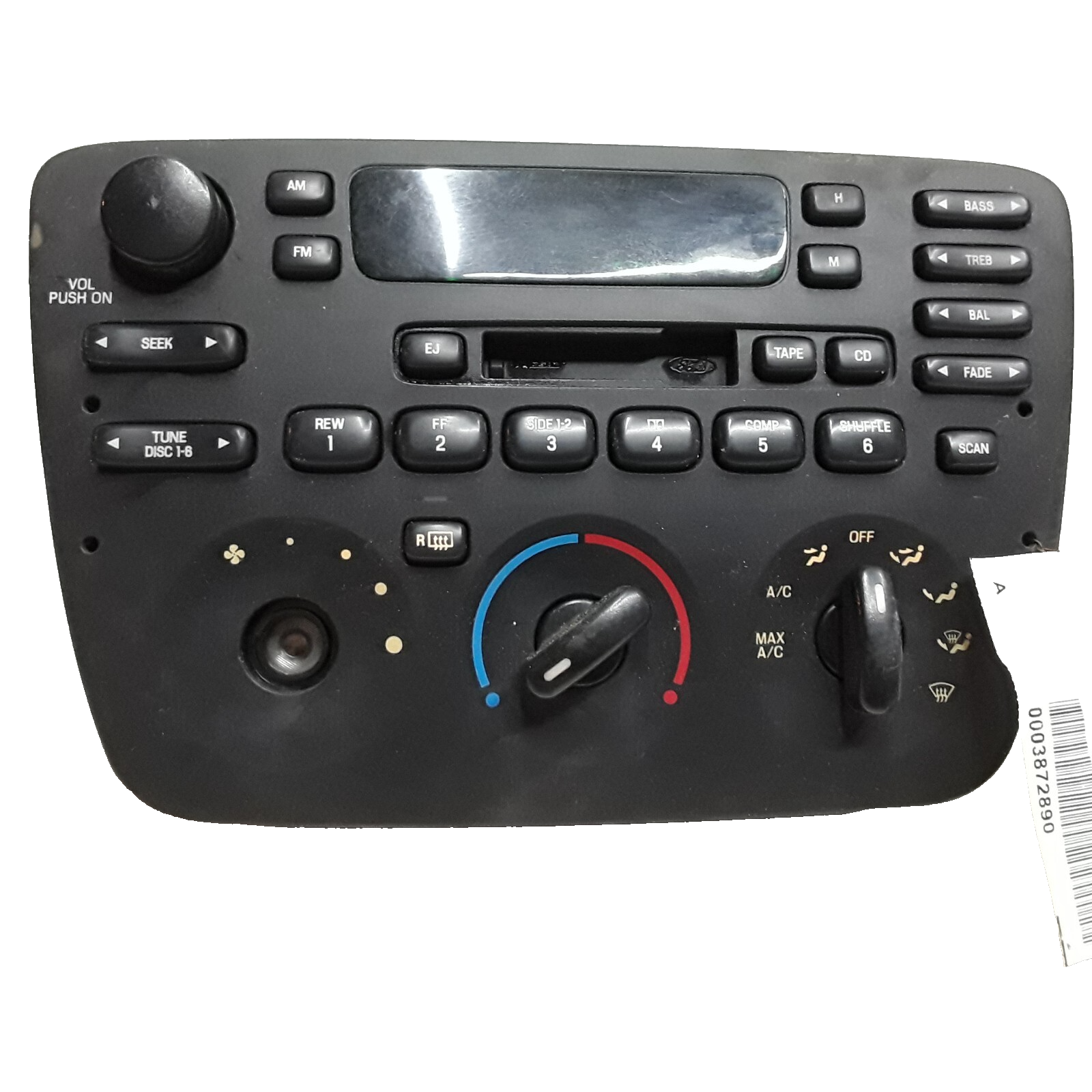 2001 to 2003 Ford Taurus AM FM cassette radio receiver with manual heater AC control. Missing speed control knob and control on the back. Easy to swap with yours.