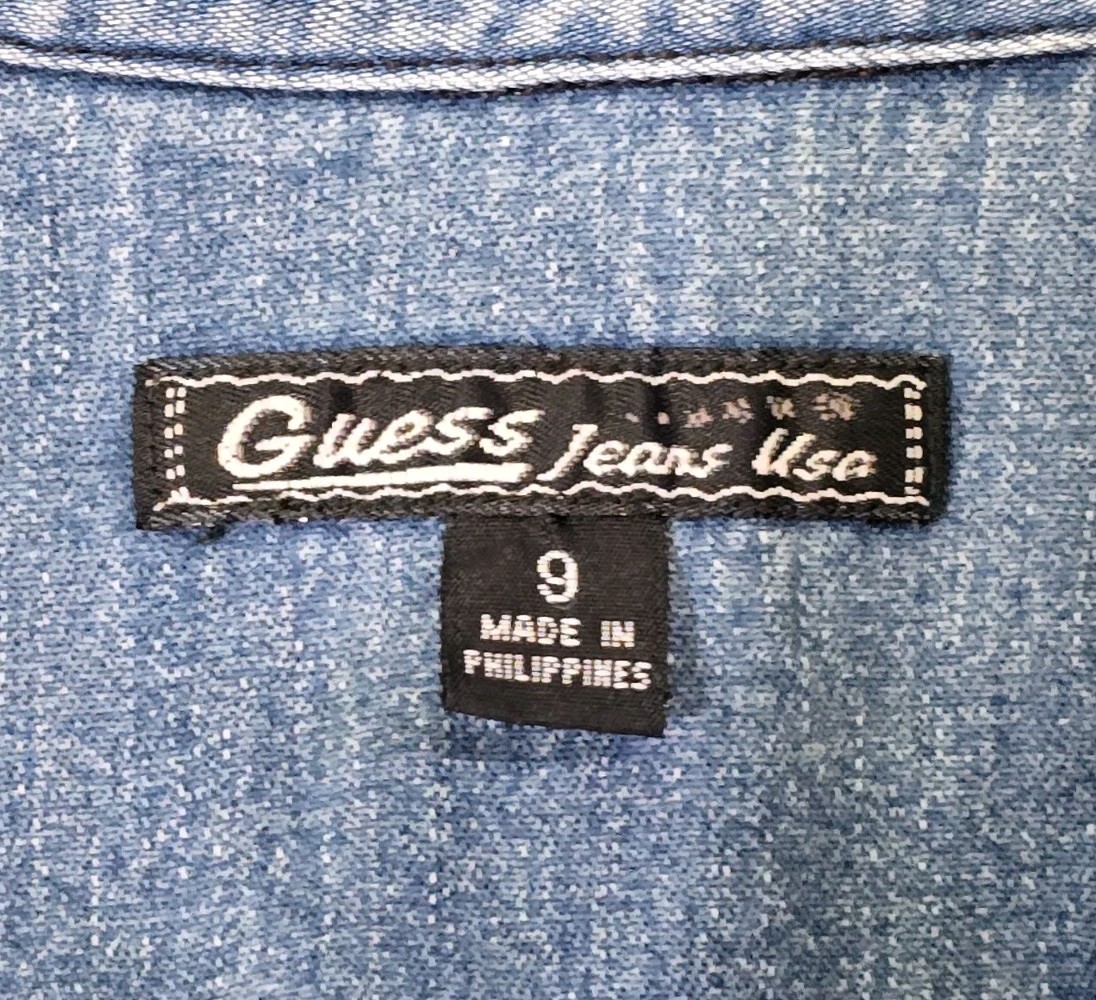 This vintage Guess Jeans mini denim dress in size 9 features a classic collared neckline, short sleeves, and button closure. Made of 100% cotton denim, the knee-length dress comes in a solid blue color with metal buttons and pockets. The retro USA-themed shirt dress showcases a timeless sheath style that is perfect for casual wear and can be machine washed for easy care. Perfect for women looking for a piece of denim history with a touch of modern flair.