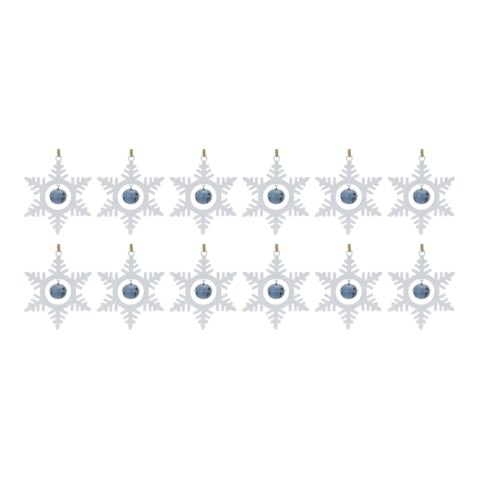 Add a timeless charm to your holiday decor with this set of Metal Snowflake with Bell Ornaments. Featuring a wintry blend of white and blue tones, these ornaments are designed to bring the perfect balance of elegance and tradition to your Christmas tree. The intricate snowflake pattern paired with a delicate sleigh bell adds a festive touch, making each ornament a beautiful piece of craftsmanship. Made from high-quality iron and finished with a sturdy jute string, these durable ornaments will last through many holiday seasons, bringing joy and warmth to your home or making the perfect gift for loved ones. Sold in a set of twelve matching pieces to create a balanced display on your Christmas tree.