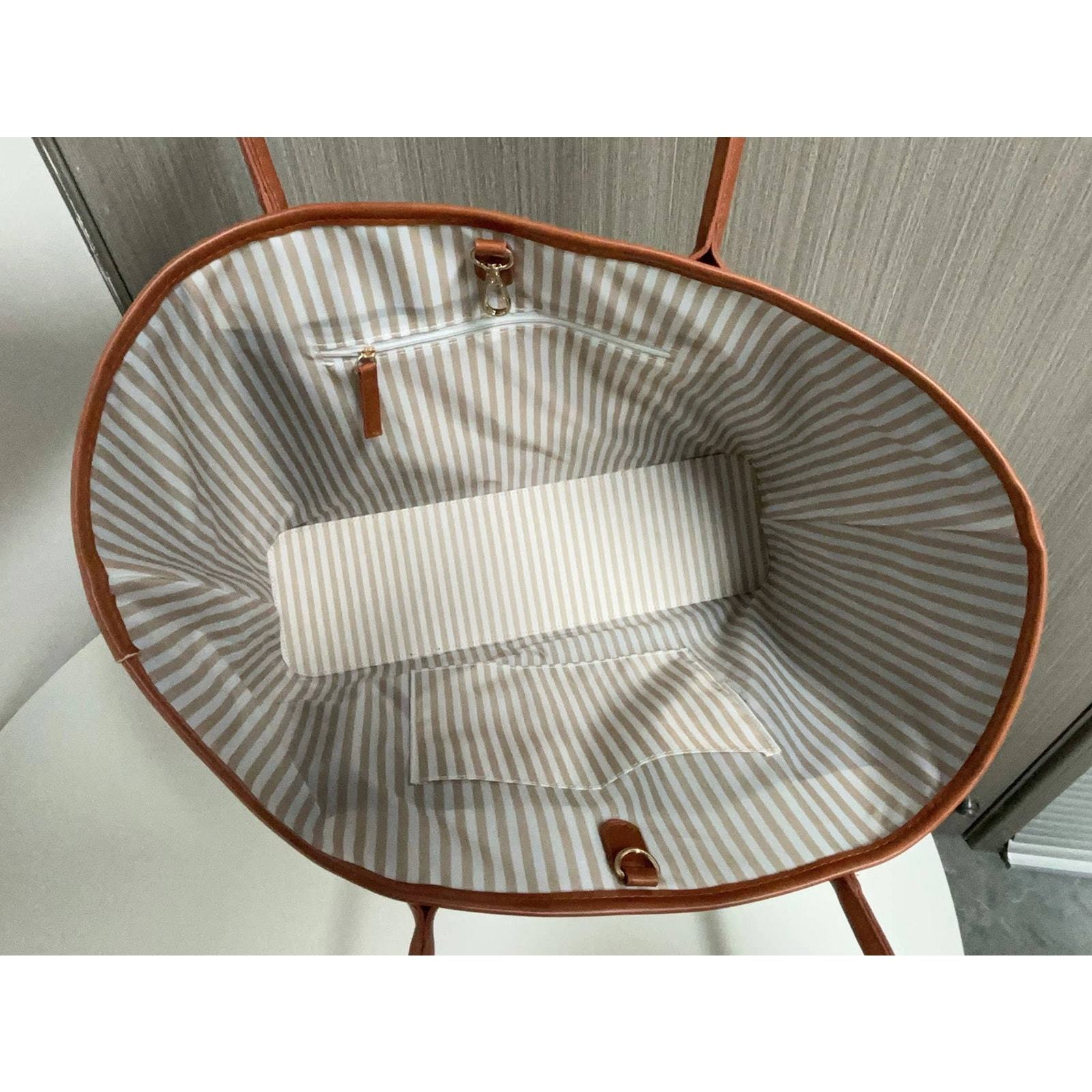 Meet your new go-to bag for fun days and spontaneous adventures?the Carryall Tote Bag! Designed with both style and function in mind, this roomy tote features a chic sandy beige base accented Saddle Brown trim. The interior is fully lined with a playful striped fabric that adds a pop of personality every time you open it. Inside, you?ll find two handy pockets?one with a zipper for keeping valuables secure and another open for easy access to your phone or keys. The lobster claw clasp at the top keeps everything in place while still giving you quick access on the go. Whether you're headed to the beach, the farmer?s market, or out for the day, this tote is built to hold it all?snacks, sunscreen, a good book, and more. Lightweight yet durable, the Carryall Tote Bag is the perfect companion for all your warm-weather plans.