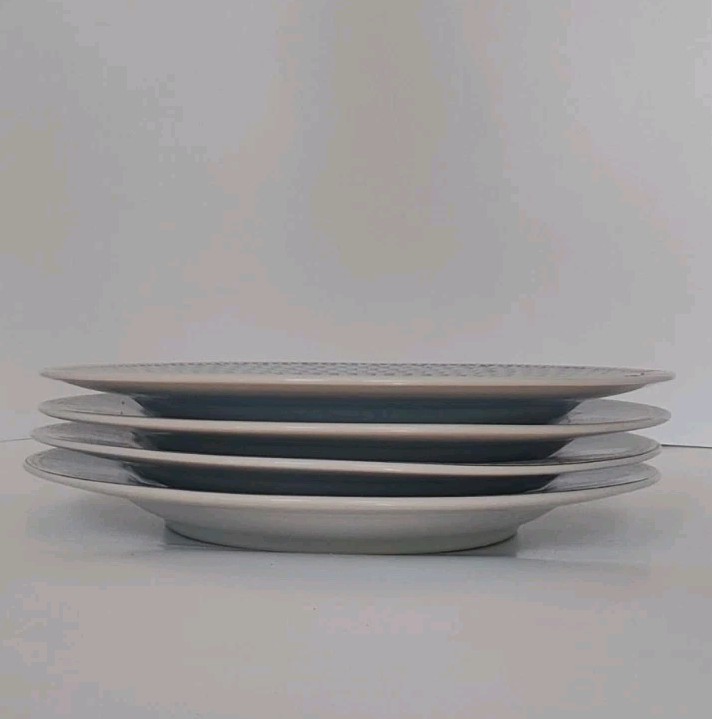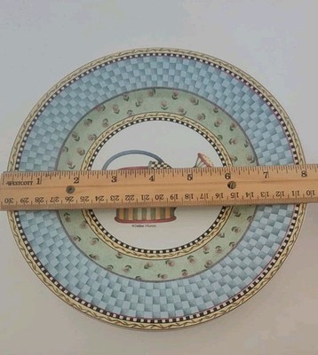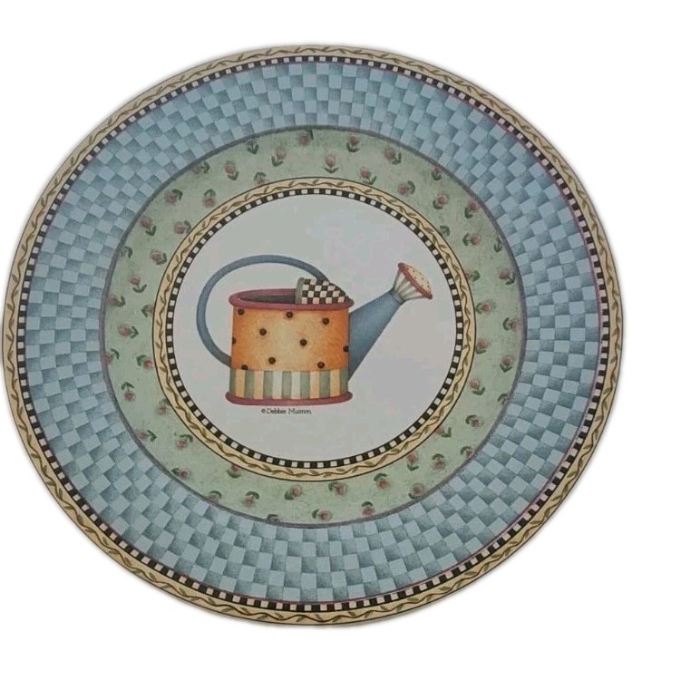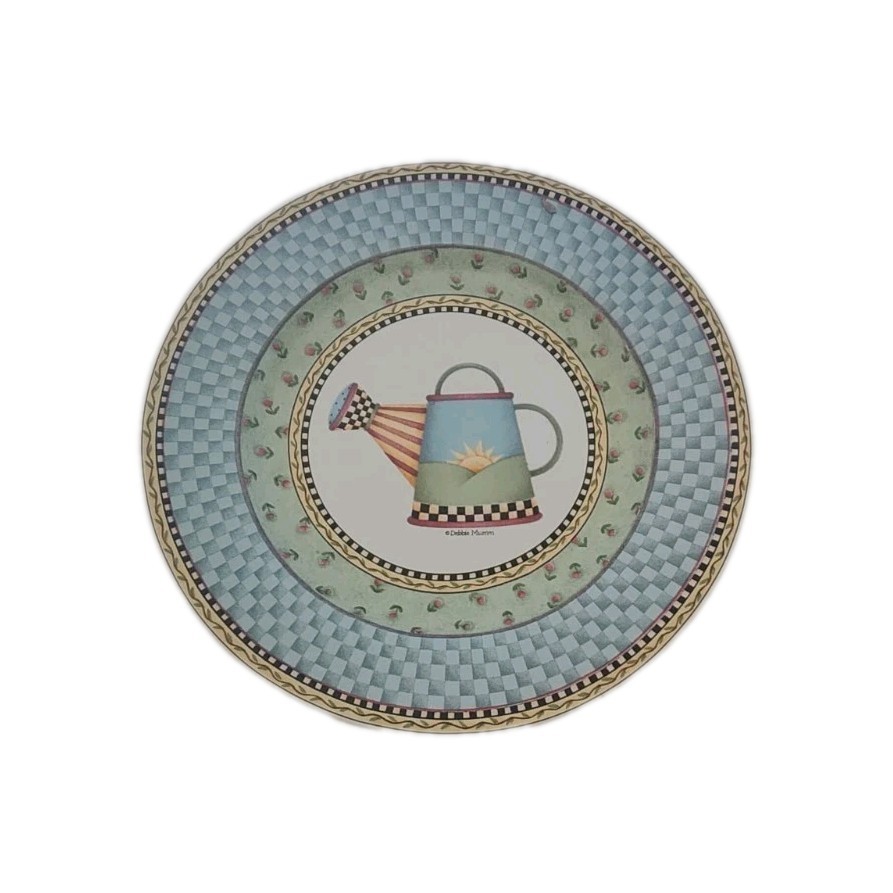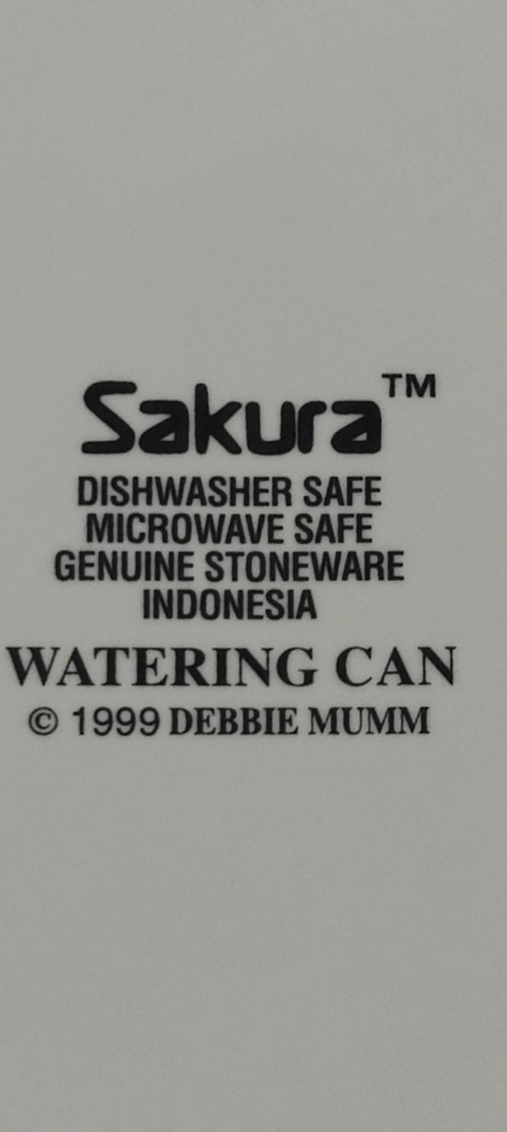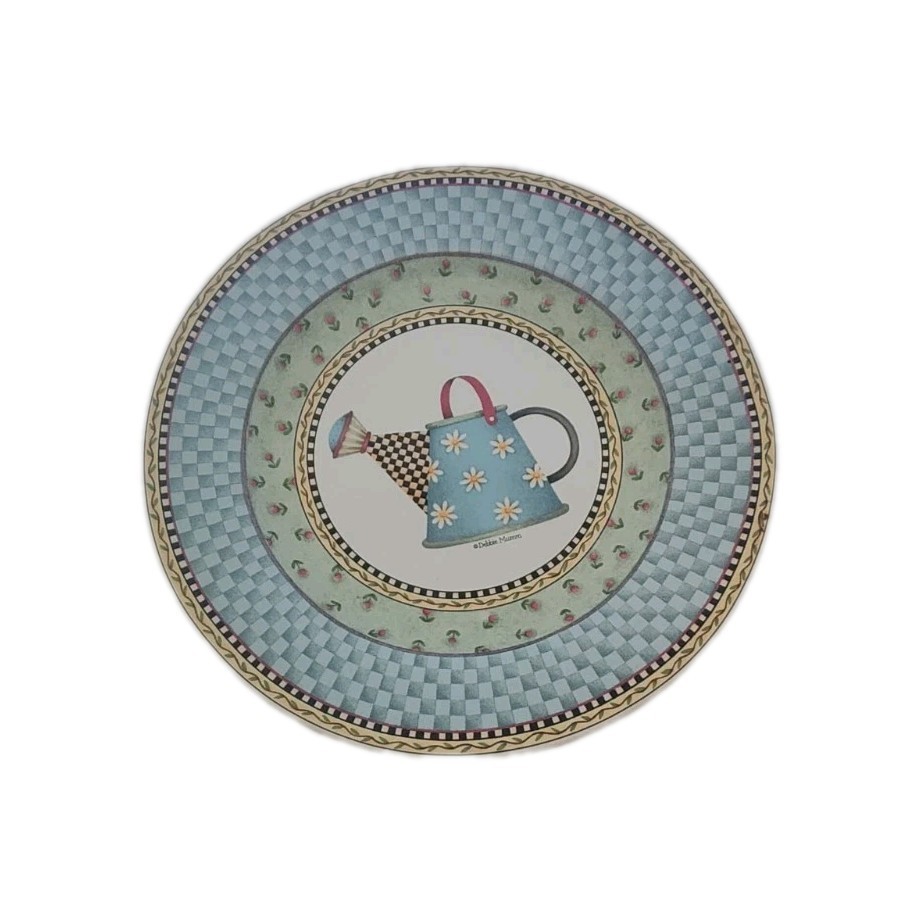 This set of 4 Sakura Watering Can Salad Plates by Debbie Mumm features a vintage garden floral checkerboard pattern, perfect for all occasions. Made of stoneware in 1999, these round plates are stackable, microwave and dishwasher safe, and add a decorative touch to any table setting. With an arts crafts/mission style and a colorful multicolor design, these original salad plates are a charming addition to any collection. Made in Indonesia, these decorative plates are a nostalgic piece from the 1990s.