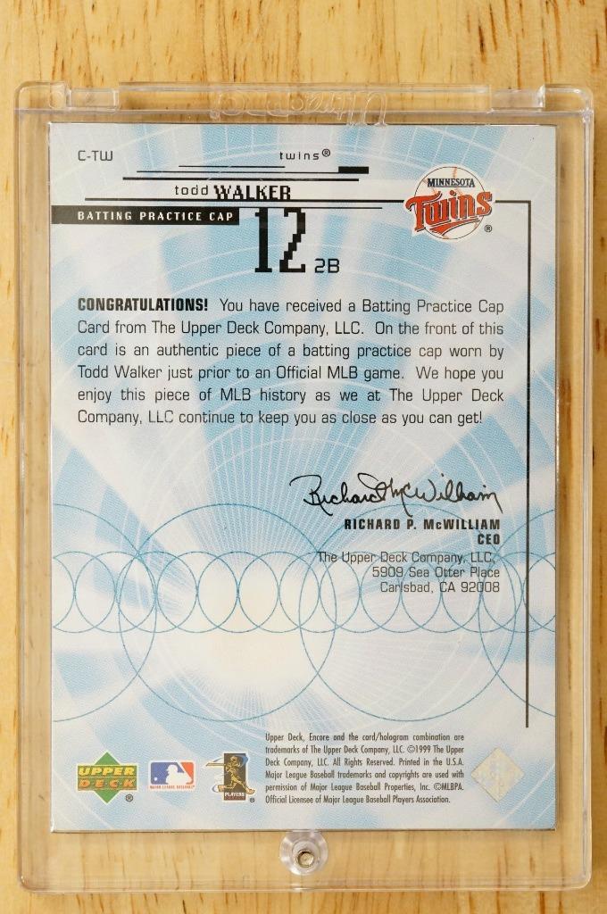 1999 Todd Walker Batting Practice Cap Relic Upper Deck Encore Patch C-TW. Raw and ungraded. No smoke or pet odor.