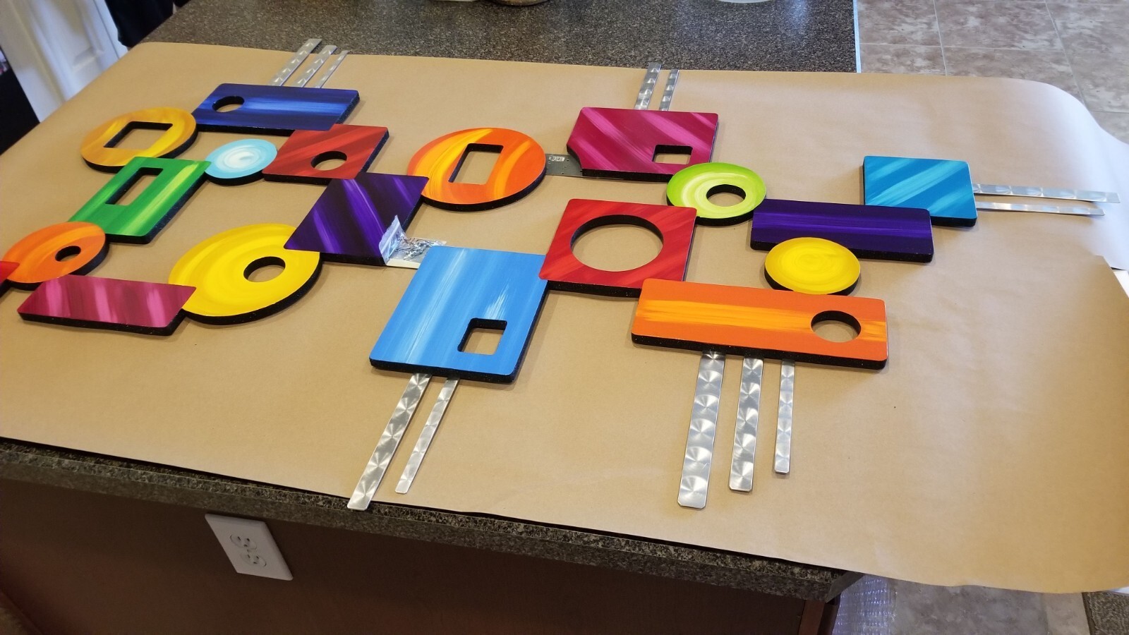 Modern Geometric wall sculpture, wood and metal wall art, abstract-5pc 63x36 +4p