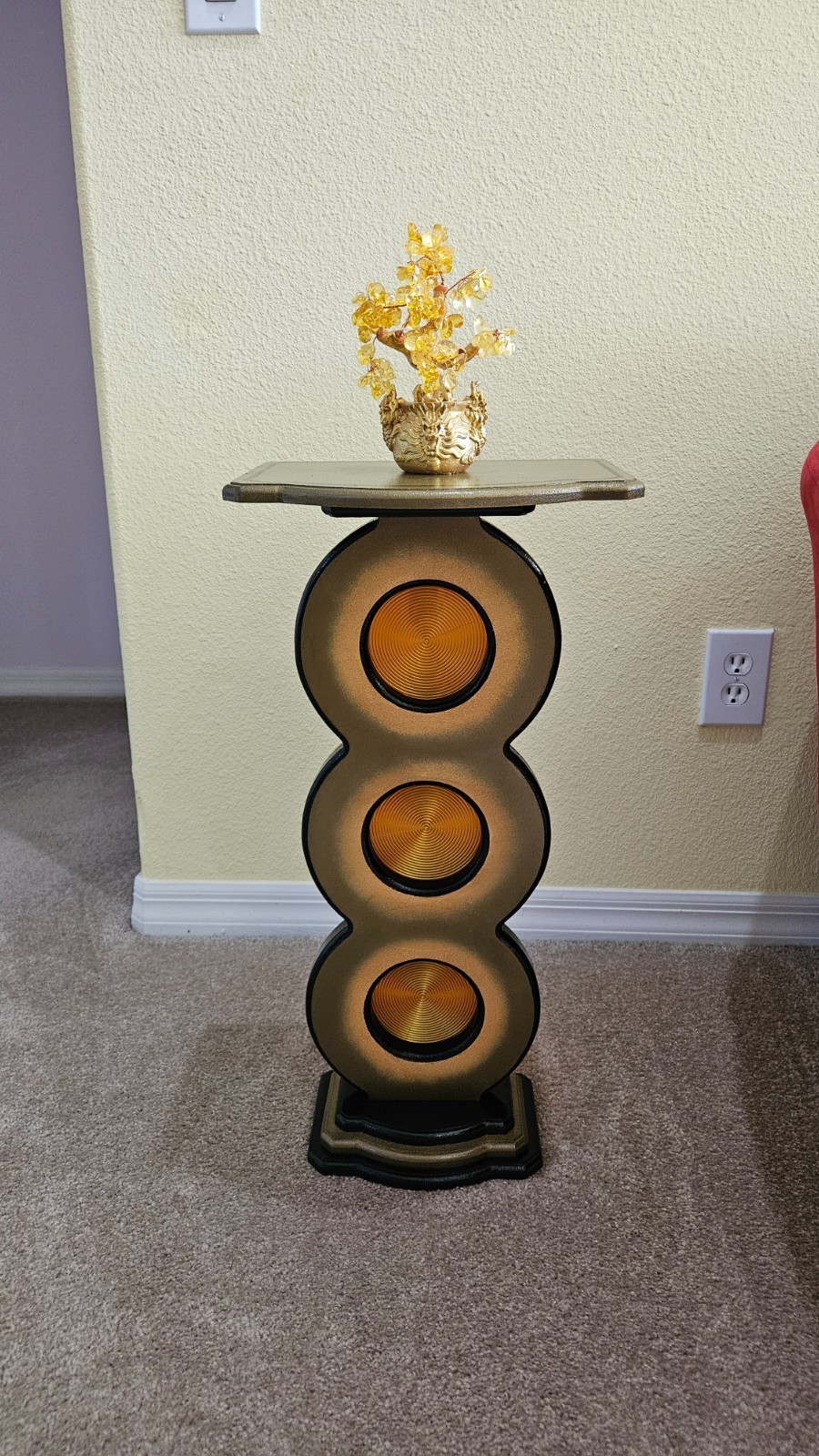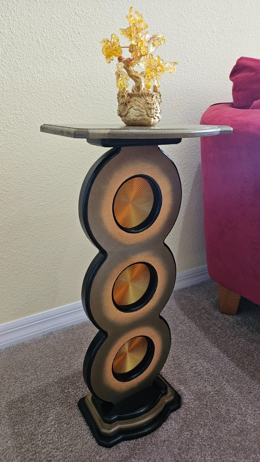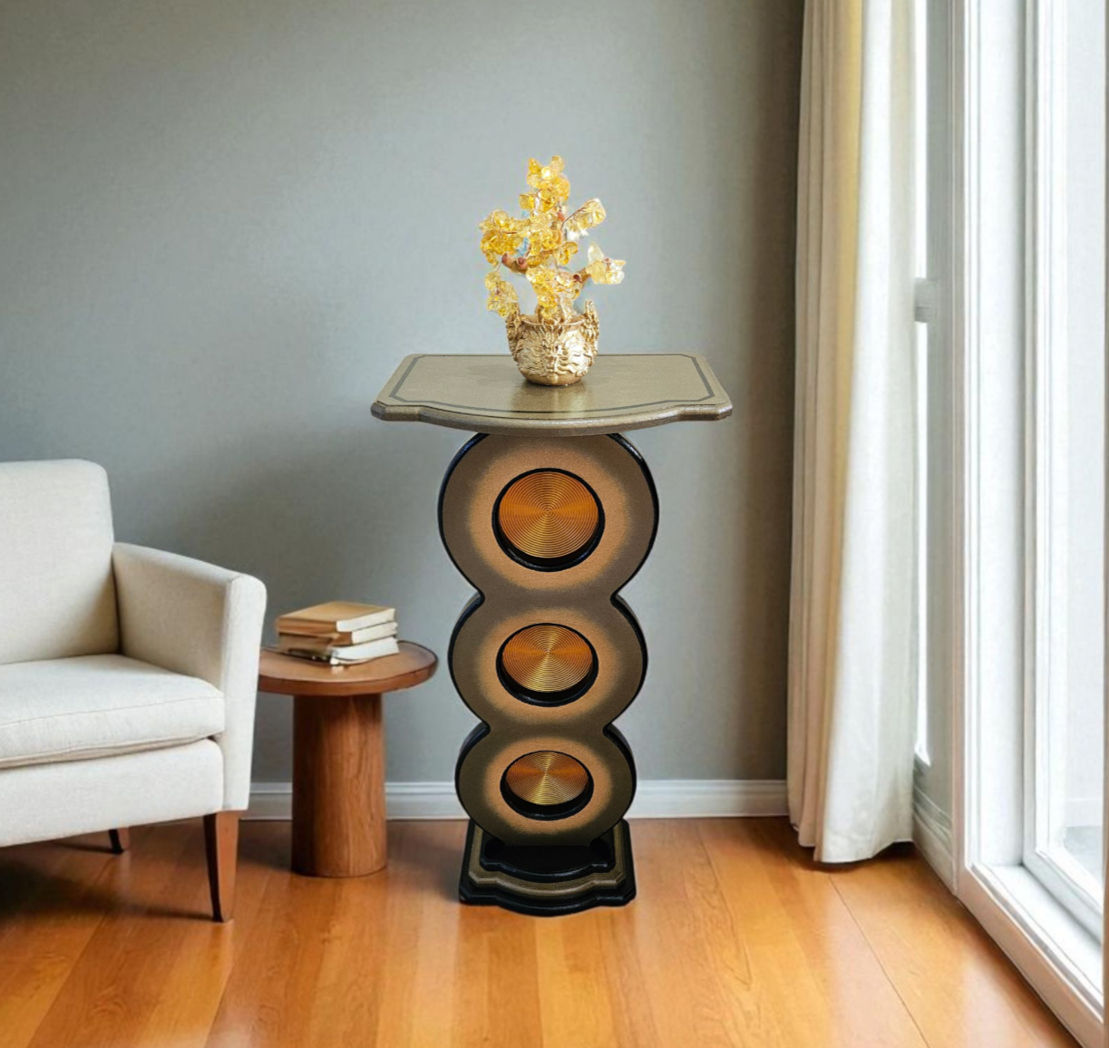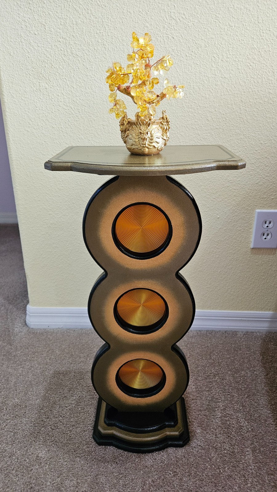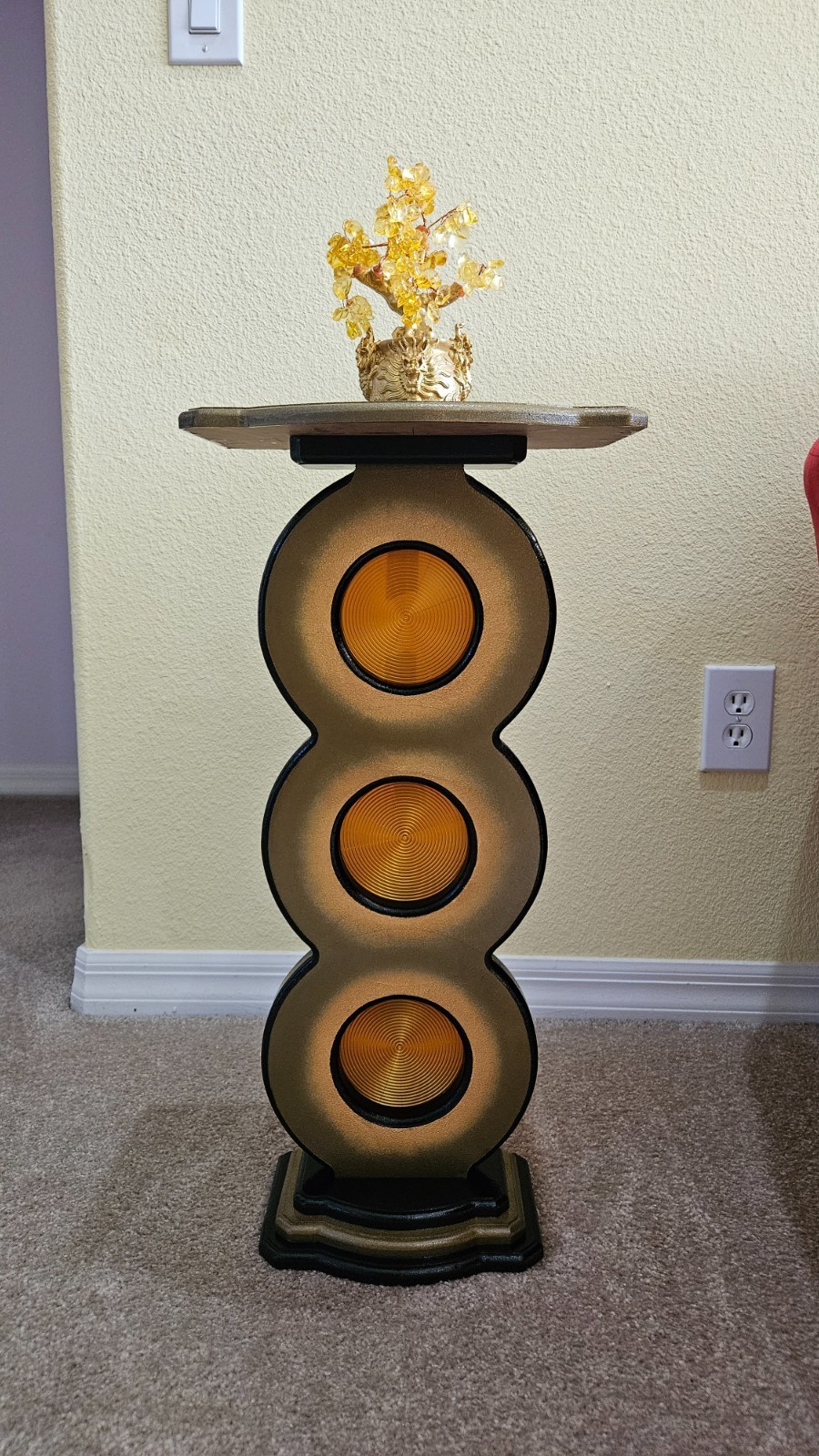 This unique bronze gold spiral up pedestal stand by Art69 is a stylish and artistic addition to any room in your home. Standing at 25 inches tall, this vertical stand features a unique and versatile style design with routed cut out circles features a gold spiral pattern that adds depth and a touch of elegance to your space. Made of quality MDF wood with 3D printed accents. This pedestal is painted in bronze, gold, and black and finished in a high gloss lacquer for lots of shine and protection over the years. This is an original piece for your home, office or gift giving that is sure to catch the eye!