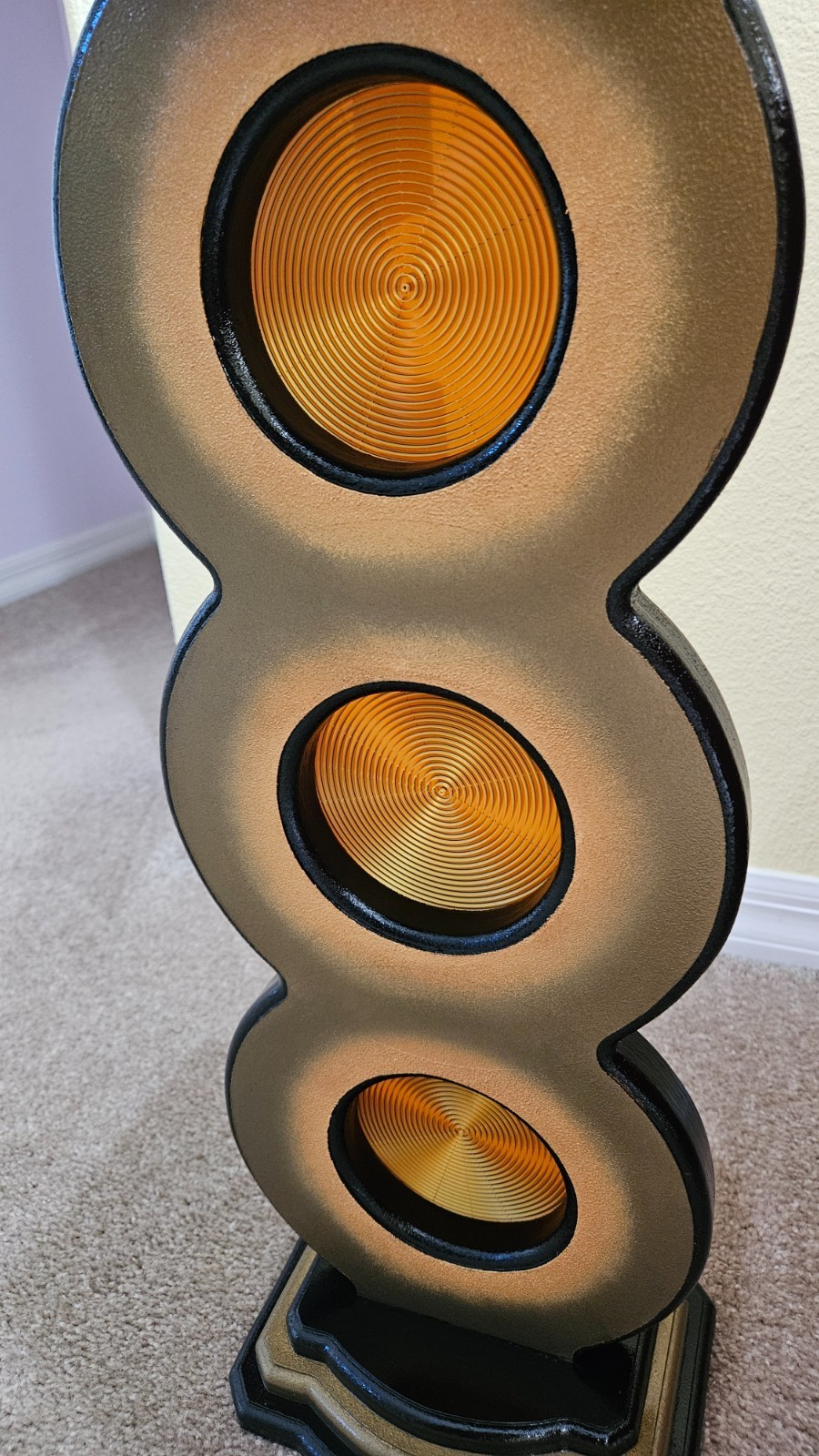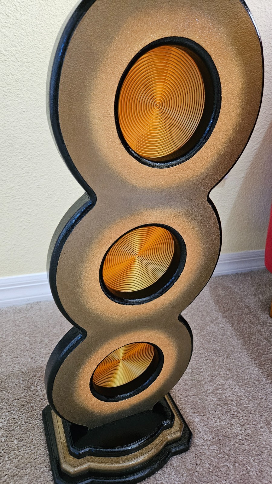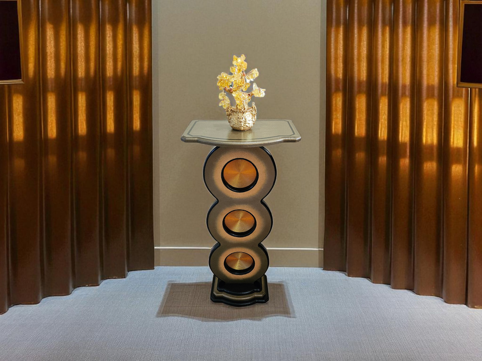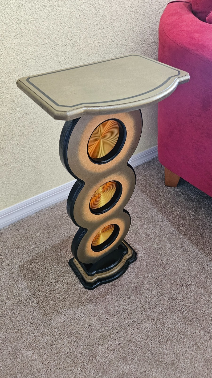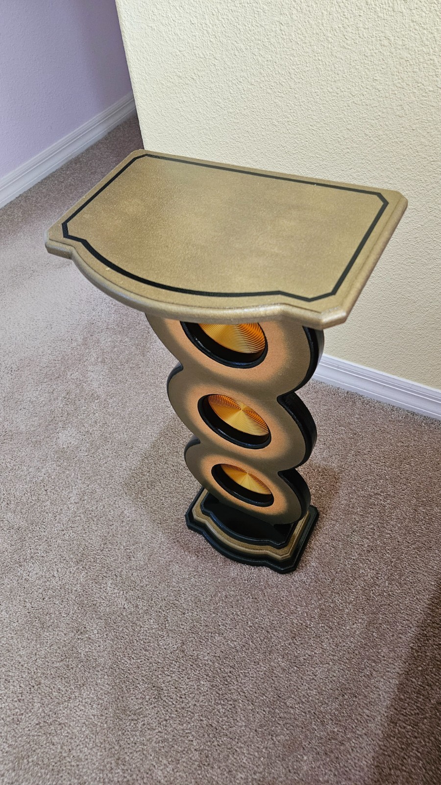 This unique bronze gold spiral up pedestal stand by Art69 is a stylish and artistic addition to any room in your home. Standing at 25 inches tall, this vertical stand features a unique and versatile style design with routed cut out circles features a gold spiral pattern that adds depth and a touch of elegance to your space. Made of quality MDF wood with 3D printed accents. This pedestal is painted in bronze, gold, and black and finished in a high gloss lacquer for lots of shine and protection over the years. This is an original piece for your home, office or gift giving that is sure to catch the eye!