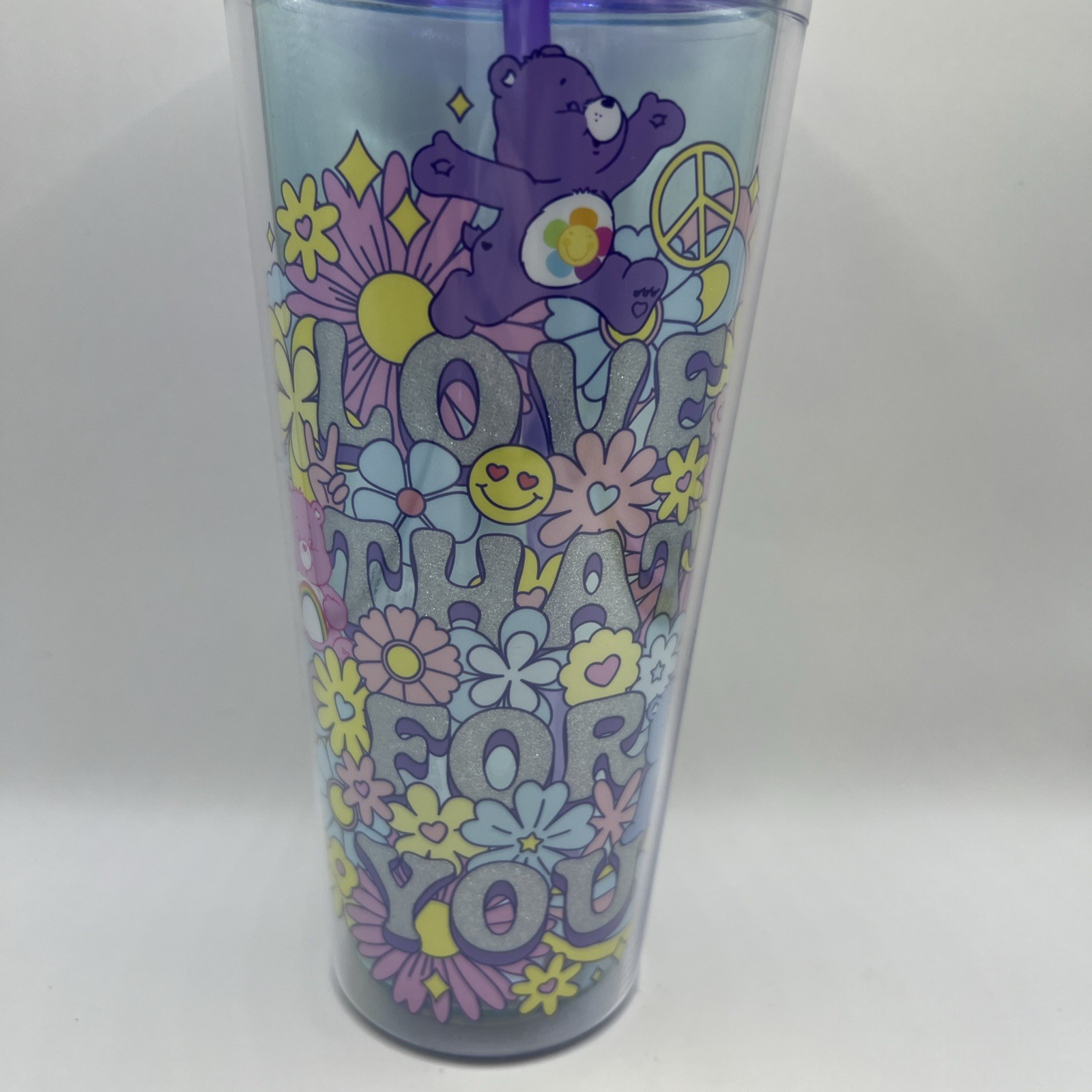Bring peace, love, and Care Bears charm to your drinkware collection with this brand new 24 oz tumbler! Featuring a colorful retro floral design and multiple Care Bears including Cheer Bear and Share Bear, this cup says ?Love That for You? in shimmering silver text. The reusable tumbler has a purple lid and straw, perfect for cold drinks on the go. Durable plastic construction. A must-have for fans of nostalgic vibes and adorable characters!