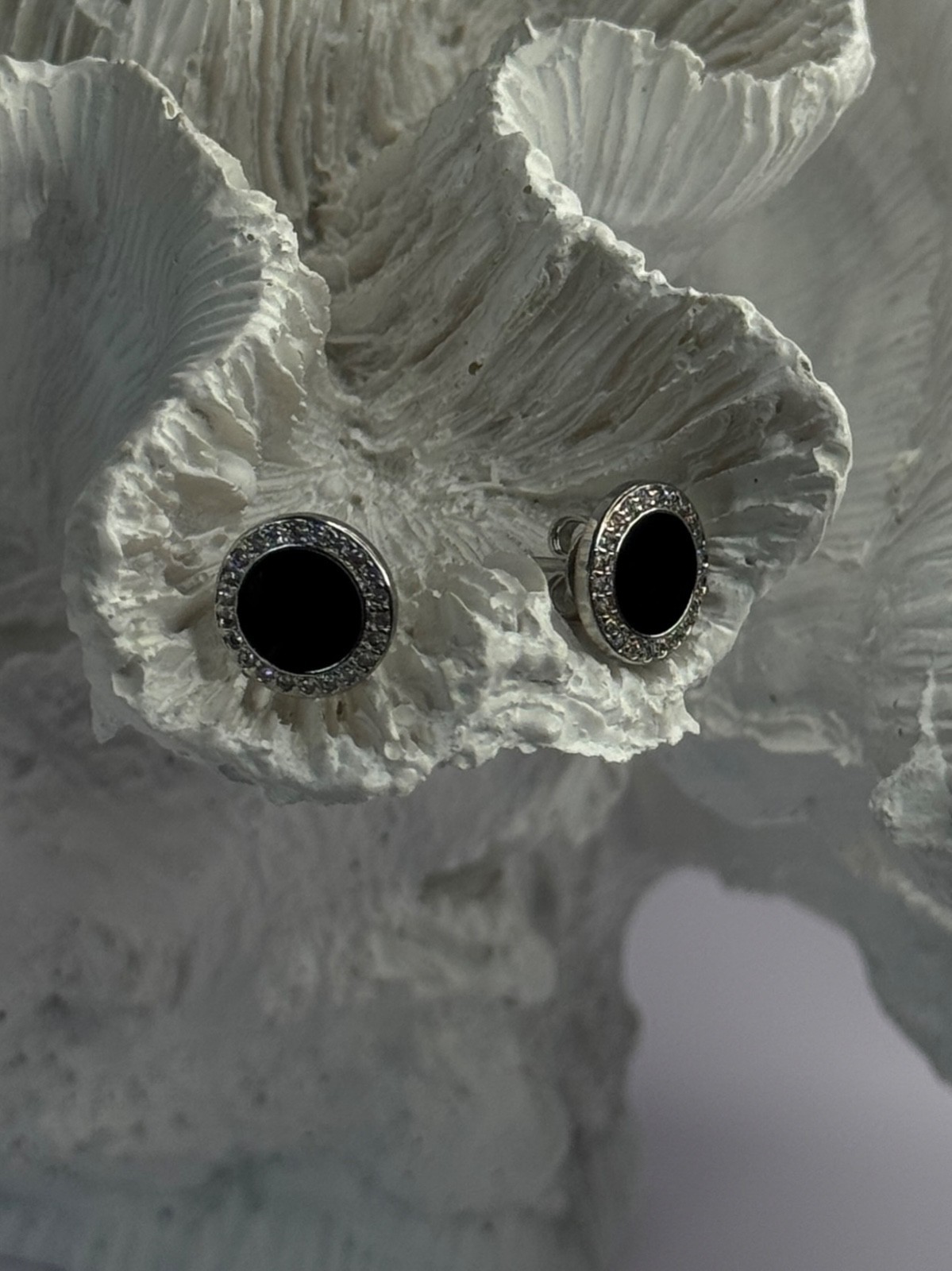 ELEGANT 925 STERLING SILVER ONYX & CZ STUD EARRINGS LENGTH 0.40 INCH