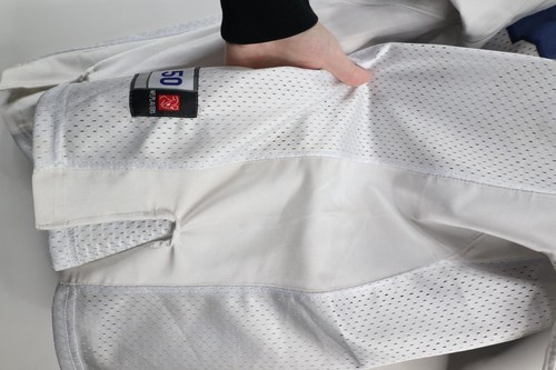 Blemishes, loose threads on collar. Collar, sides discolored. Designs distressed