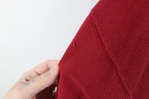 Holes collar, arms/cuffs. Blemishes shoulders, collar, back top. Collar, cuffs discolored. Color faded. Pilling