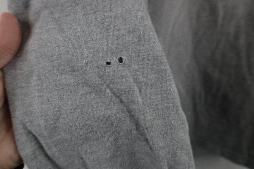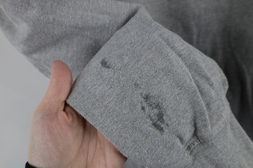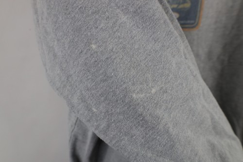 Bleach stains/stains, dark spots throughout. Holes right arm, cuff. Graphics, color faded. Pilling. Made in USA