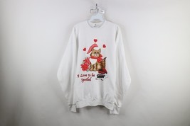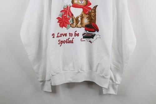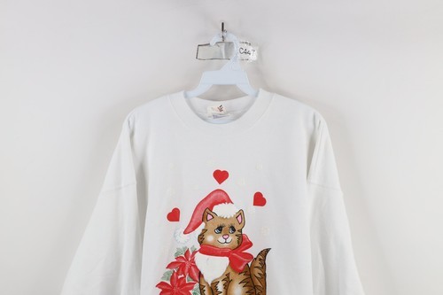 Deadstock Vintage 90s Womens Large Christmas Cat Kitten Heart Sweatshirt White