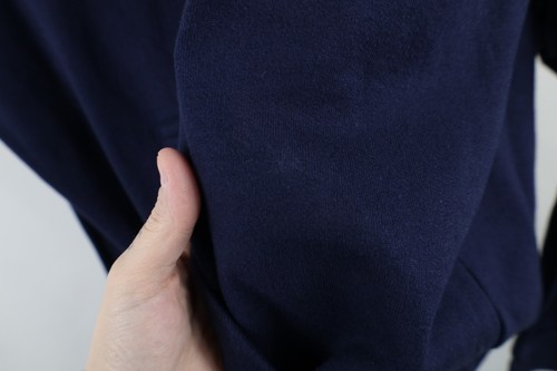 Blemishes front, right arm. Stains back top. Color faded. Pilling