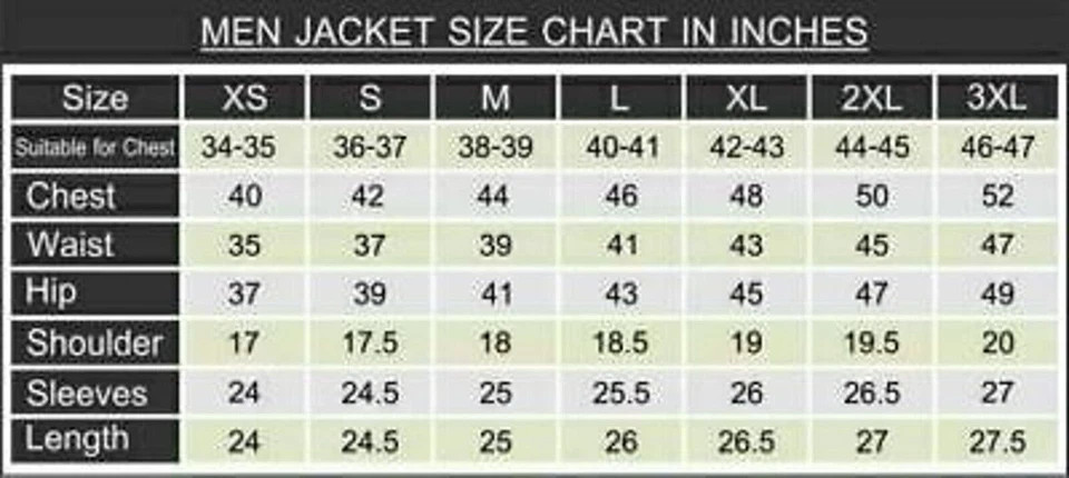 We suggest you; jacket Chest size must be 4 inches OR 10 CM bigger than your actual body Chest size.