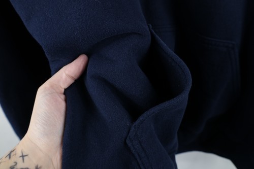 Stains front, right arm. Hood, cuffs discolored. Graphics, color faded. Pilling