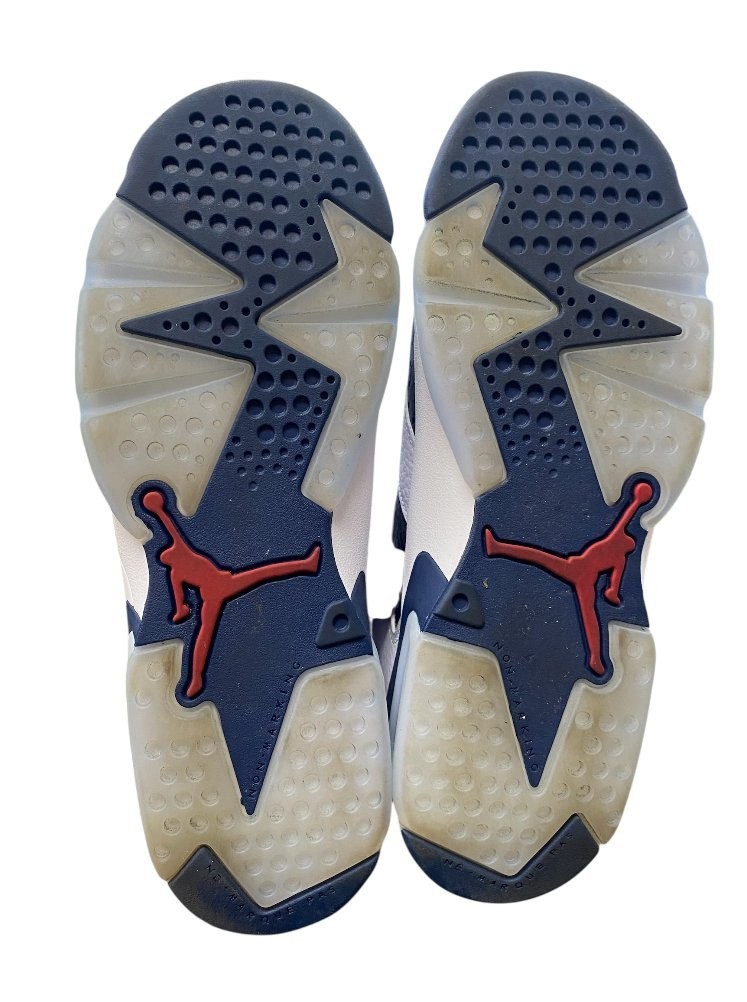 Type: ShoesBrand: Nike Air JordanModel name: Retro 6 OlympicModel number: 384665-164Color: White BlueSize: 6.5 Y BoysBox included: noMaterial: LeatherCondition:Used