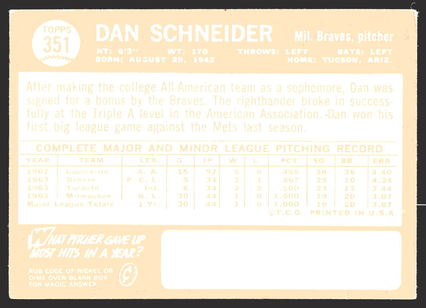 1964 Topps #351 Dan Schneider Atlanta Braves VG- Very Good -EX- Excellent