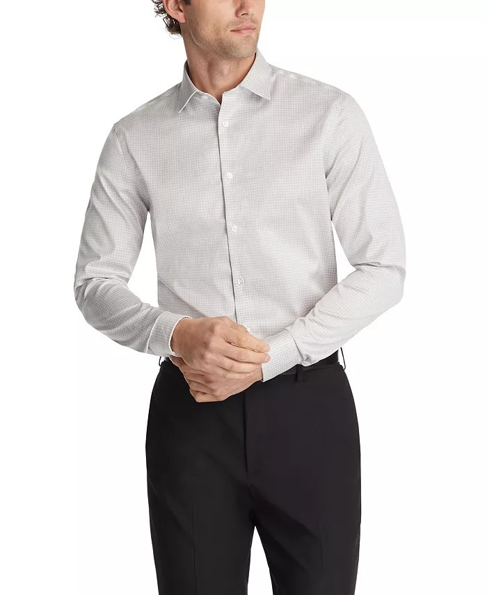 The Calvin Klein Steel dress shirt is engineered for performance. High-tech wrinkle-free stretch fabric requires less ironing, while wicking properties pull away moisture for cool, dry comfort. A Regular fit delivers a classic look that defines refinement.