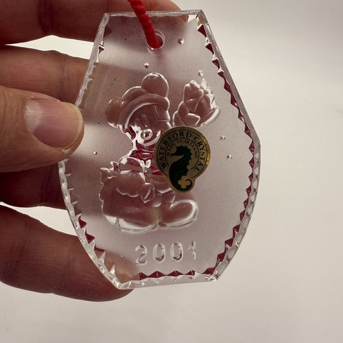 Waterford Crystal 2001 Disney Mickey Mouse Ornament is a frosted vintage collectible made of crystal. It features Mickey Mouse and is part of the Disney franchise. This ornament was manufactured in Ireland by Waterford, known for their high-quality crystal products. An elegant and festive addition to any holiday decor collection.