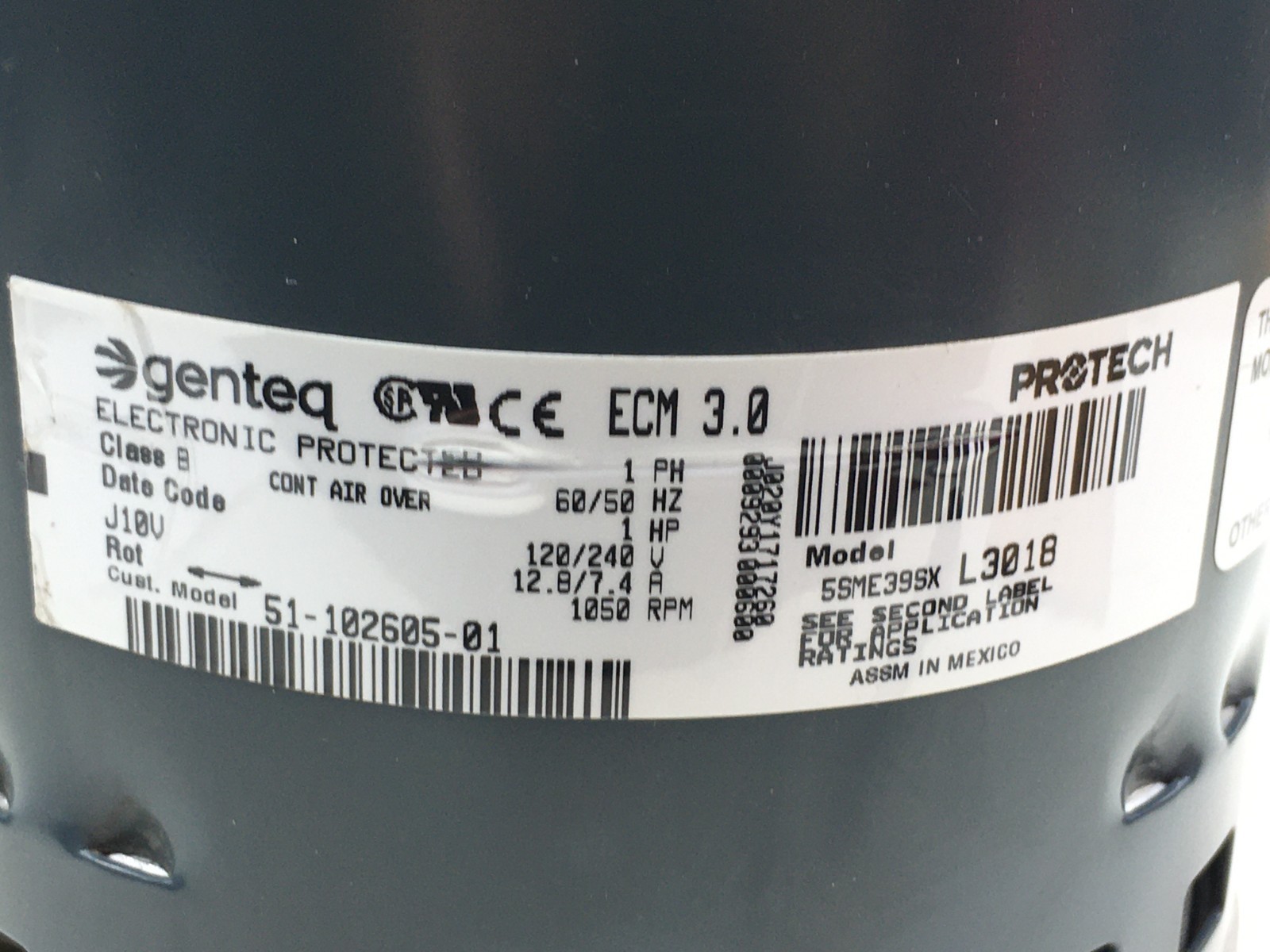 This is GENTEQ ECM 3.0 MOTOR 1 HP 1050 RPM 5SME39SXL3018 p/n 51-102605-01 GC07 CCWLE rotation used part.