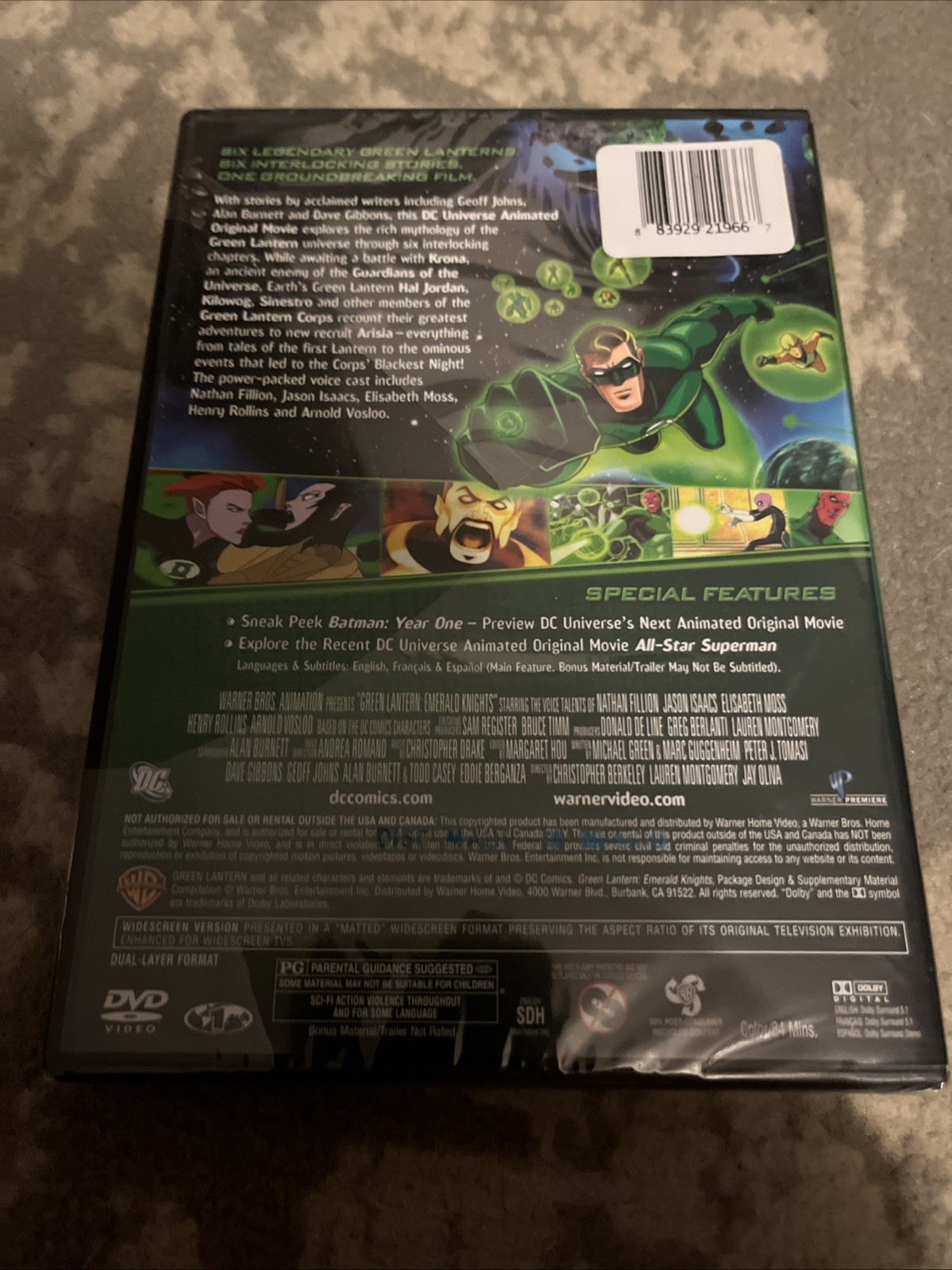 The product is a new sealed DVD of the animated superhero film "Green Lantern: Emerald Knights" released in 2011. Produced by Donald De Line, Greg Berlanti, and Lauren Montgomery, this PG-rated movie features a run time of 84 minutes and is presented in English language. Directed by Chris Berkeley, Christopher Berkeley, Jay Oliva, Lauren Montgomery, and others, this animated superhero flick produced by Warner Home Video is a must-have for fans of the genre.