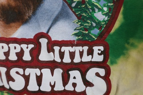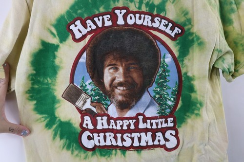 Retro Bob Ross Mens Medium Spell Out Acid Wash Happy Little Christmas T-Shirt