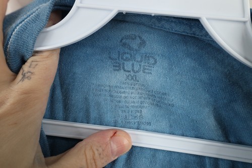 Collar stretched/discolored. Graphics, color faded. Pilling
