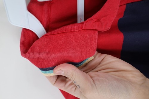 Stains front, collar. Holes side slits. Color faded. Pilling. Collar discolored. Made in USA