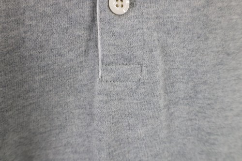 Loose thread front middle. Collar, armpits discolored. Color faded