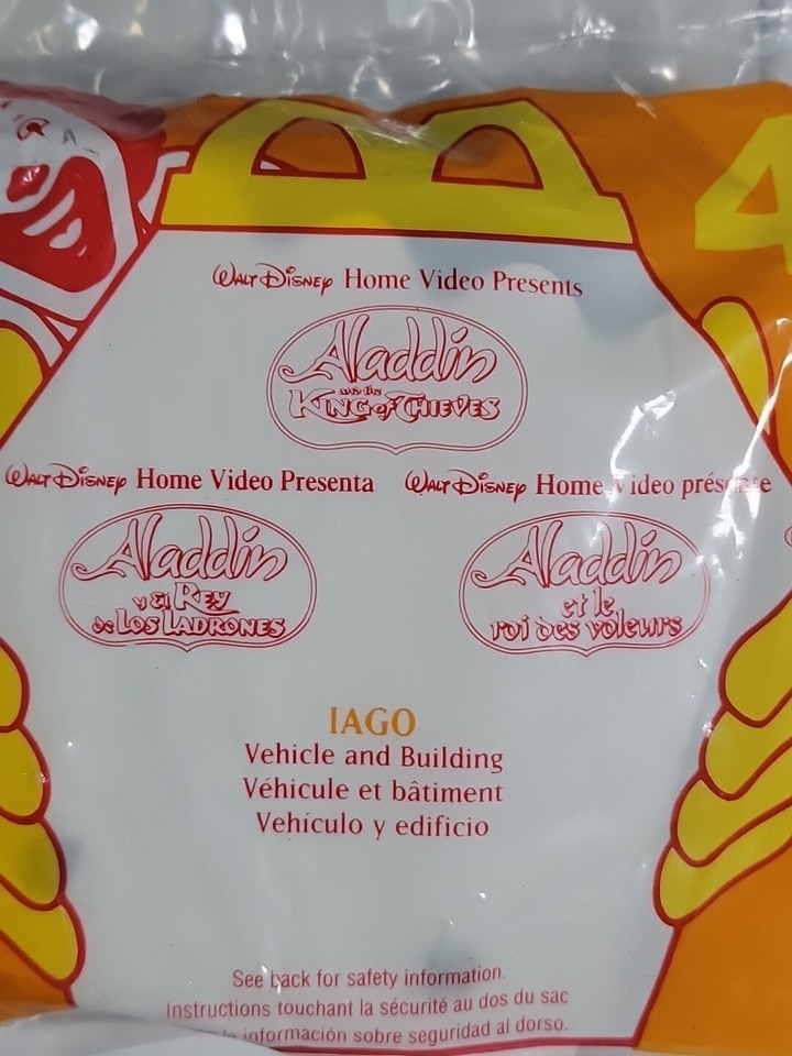The product is an Aladdin-themed McDonald's Happy Meal toy from 1996, featuring Iago, a character from the Disney movie Aladdin. This toy includes a vehicle and a building for Iago to play with. It was manufactured in China and is part of the Aladdin character family. This collectible toy offers a nostalgic piece of Disney and fast-food memorabilia from the 1990s.