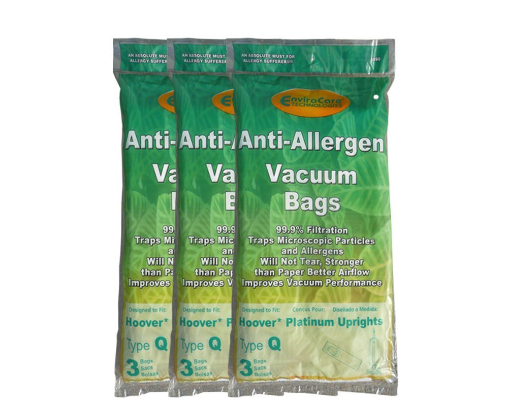 Product description: Hoover Platinum Uprights Type Q HEPA Allergen Upright Vacuum Cleaner Bags Each manufacture package includes 3 cloth-like white Allergen HEPA Vacuum Bags made by EnviroCare Part #A890 Contact me if you are interested in larger wholesale quantities of this or other products. Envirocare Parts designed to fit with or replace genuine original (OEM) manufacture part numbers below: #302982002, AH10000 Designed to fit the vacuum models listed below and more: Hoover Upright Vacuums: Style Model Numbers Platinum Collection UH30010 Platinum Bagged Upright with Handheld Canister UH30010CCA Platinum Collection Lightweight Bagged Upright with Handheld Canister UH30010COM Dimensions: 2 x 2 OE? Hole Diameter 24 oe? x 6 oe? Bag Size 7 oe? x 4? Cardboard Traps and seals-in 99.7% of dust mites, pollens, ragweed, mold spurs, microscopic particles, bacteria, dust mites, germs as small as 0.1 micron, other allergy causing agents, and 99.9% of pet dander. A must for Allergy Sufferers!