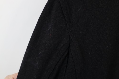 Thrashed. Left cuff partially unstitched. Stains, discoloring throughout. Color faded. Pilling