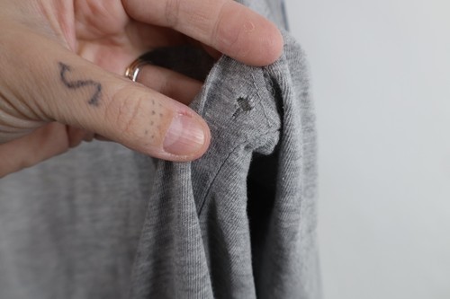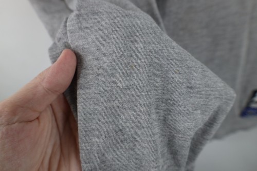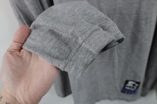Hole left armpit, holes right arm. Loose threads/unstitched left cuff. Stains front, back. Collar stretched. Collar, cuffs discolored. Graphics, color faded. Pilling, dark spots